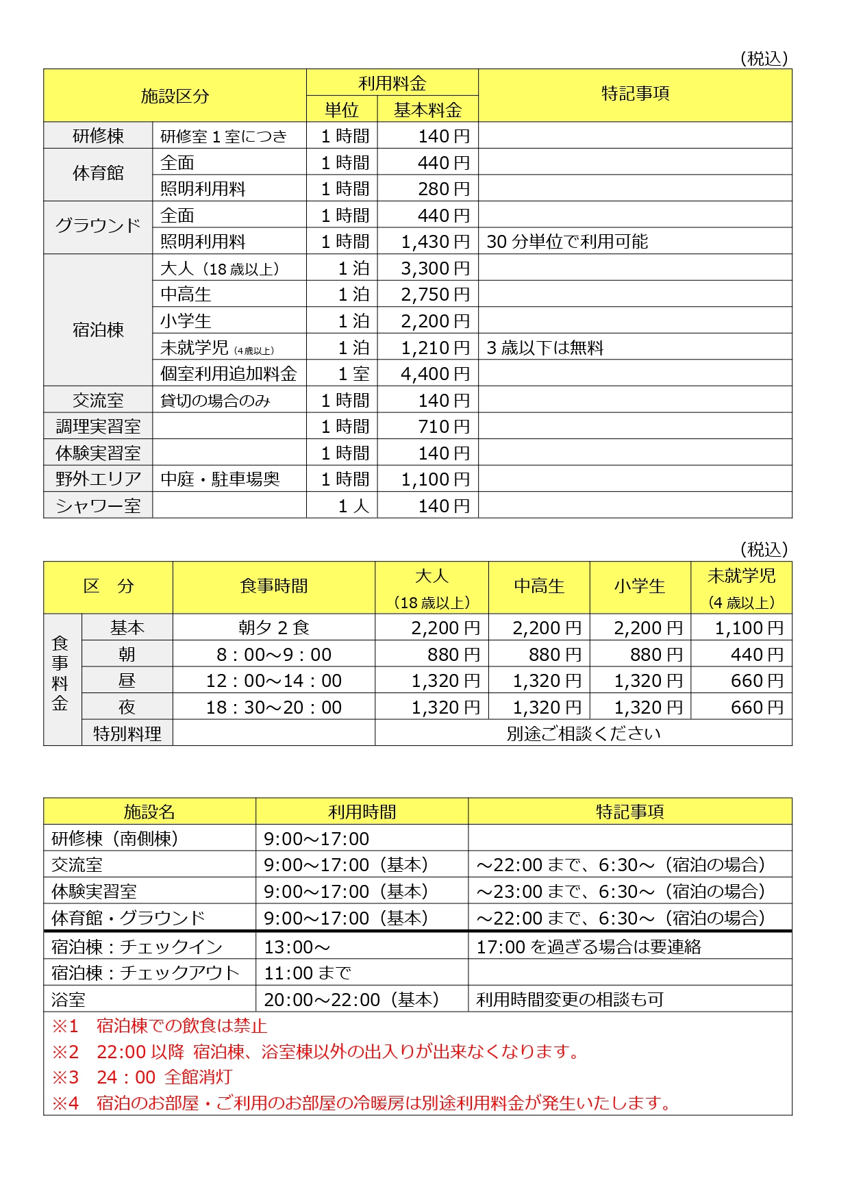 | 開館時間 | 研修棟・・・9:00~17:00 体育館およびグラウンド・・・9:00~22:00 宿泊棟・・・13:00~翌日11:00 |
